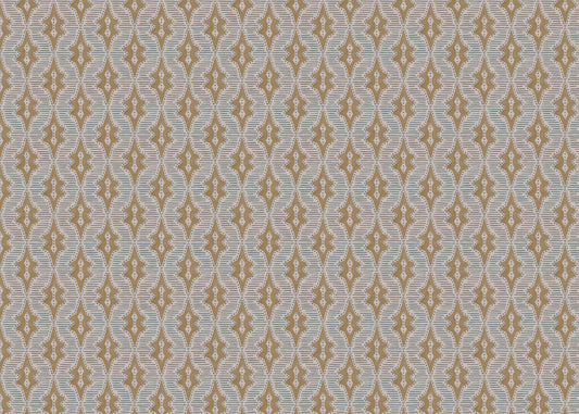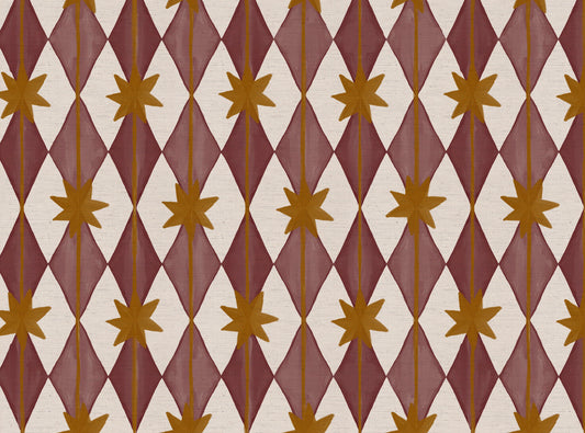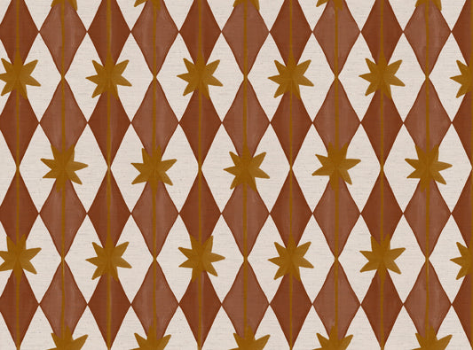 Painterly diamond motifs in rich tones create a striking backdrop for bold ochre starbursts.