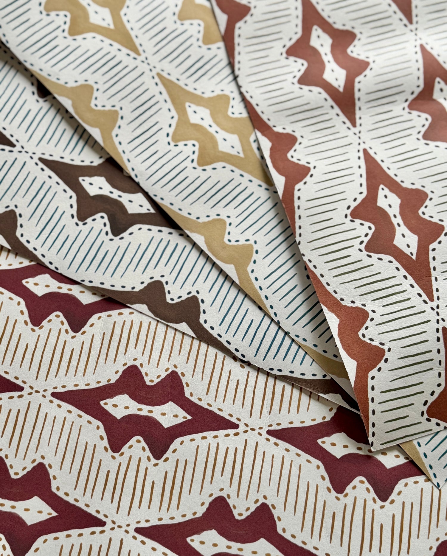Painterly diamond motifs in rich tones create a striking backdrop for bold ochre starbursts.