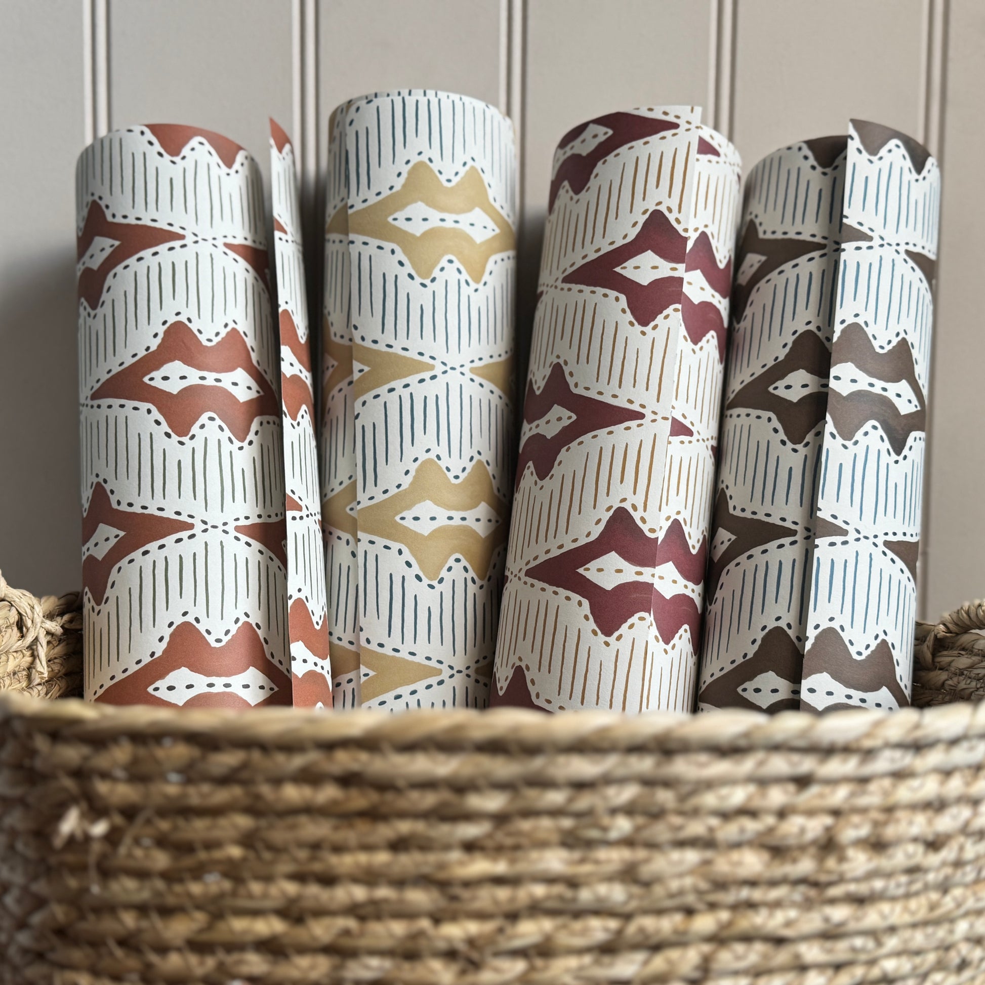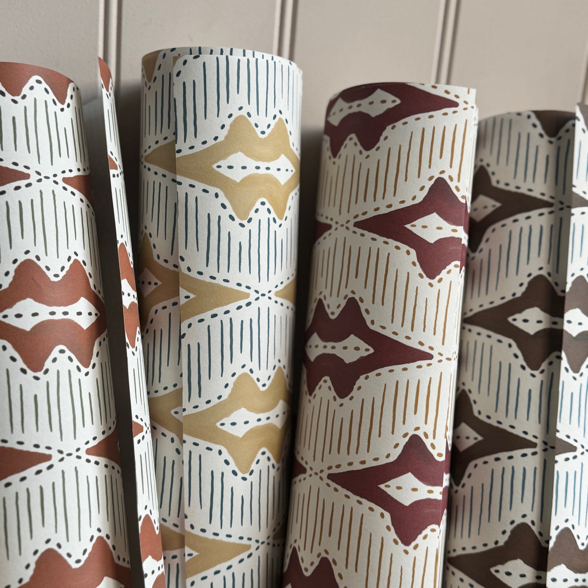 Originally hand painted in Ashleigh Mercia’s Highland studio, Sky Lanterns features an elegant repeat of soft geometric forms in rich earthy tones. The design’s subtle symmetry and natural texture lend an effortless sophistication, creating interiors that feel both grounded and uplifting.